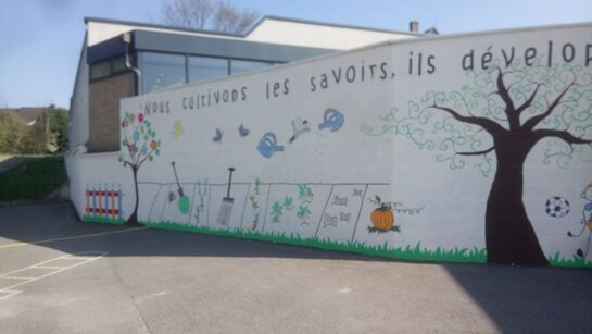 Depuis une année, mûri ce projet de décoration de la cour d’accueil de l’école. Ce projet a pu se concrétiser au cours des vacances de printemps.