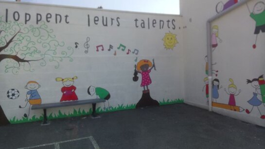 A partir de cette inspiration, un décor a été dessiné sur les murs de la cour intérieure. Ce travail est le fruit de l’investissement de quelques enfants et leurs familles, d’enseignants, de membres du personnel.