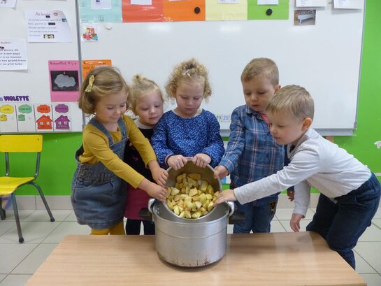 Comme chaque année, lors de la semaine du goût, la classe de TPS-PS accueille des parents pour réaliser la compote de pommes. Deux mamans et un papa sont venus aider les élèves à éplucher et découper les pommes.