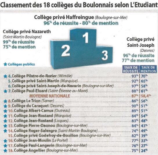 Saint Joseph N°3 au classement des collèges du Boulonnais