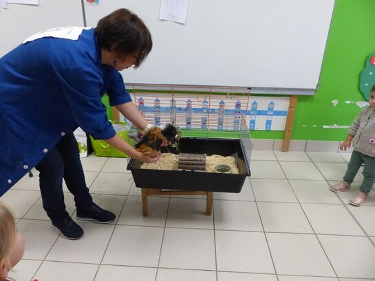 Chaque enfant a participé à la préparation de la cage. Tous les matins, le responsable lui donne à manger.