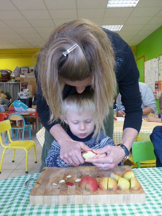 Comme chaque année, lors de la semaine du goût, la classe de TPS-PS accueille des parents pour réaliser la compote de pommes. Deux mamans et un papa sont venus aider les élèves à éplucher et découper les pommes.